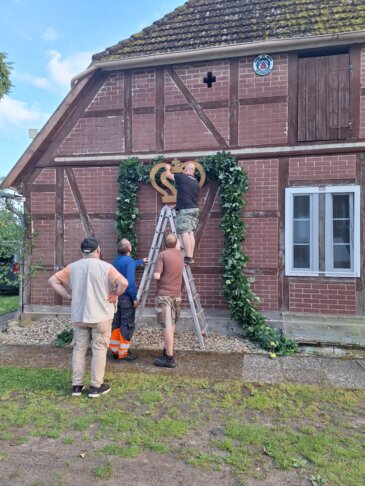 Anbringen der Eichengirlande und der beleuchteten Königskrone an der Residenz des Schützenkönigs 2024